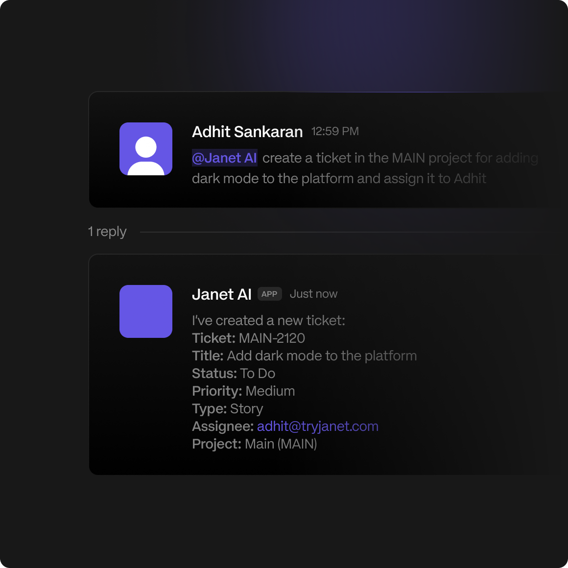 Follow-up with your team and customers instantly. Reply to issue reporters in Slack and Discord directly from Janet AI when tickets are resolved.
